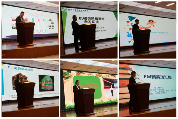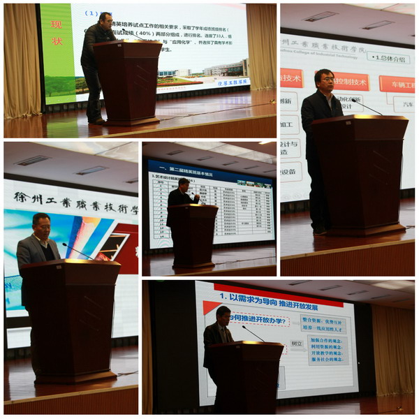 会上,化工学院刘郁副院长、机电学院娄天祥院长助理、信电学院陈祥章院长、建筑学院程建伟院长、工商学院张恒中院长、材料学院徐云慧副院长分别从精英班人才选拔、师资队伍的组建、课程实施、成果成效、意见与建议等方面就精英高职人才培养工程的实施情况作了汇报;六位精英班学生代表曹洪源、王强、顾杰、陈壹梦、杨倩倩、许高聪同学就自己参加精英班以来的学习情况及个人收获作了汇报。