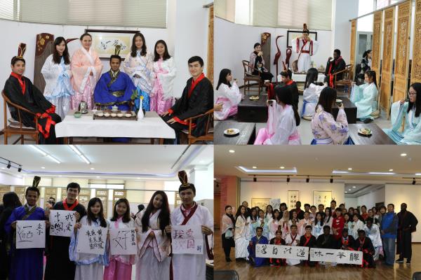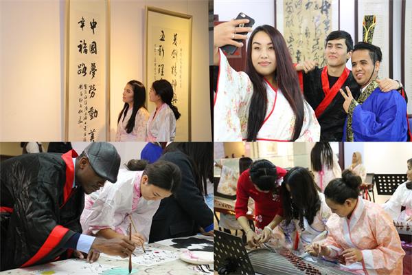 为迎接第72个世界大学生日,11月15日,化学工程学院联合招生与国际交流处组织了国内外四十余名大学生共同来到徐州市工人文化宫,开展“携手世界青年,传承中华文化”活动。来自18个国家和地区,不同民族、信仰、肤色、发色的同学们身着汉服,在中国的墨色氤氲,茶香袅袅中,体味中华文化的精致与高雅;在琴音天籁,淋漓写意中,体悟五千年积淀的厚重和基因。