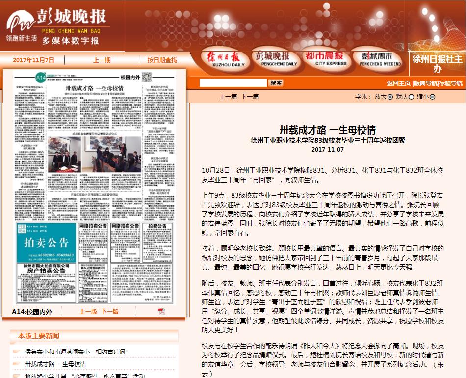 【彭城晚报】徐州工业捕鱼达人破解版 83级校友毕业三十周年返校团聚