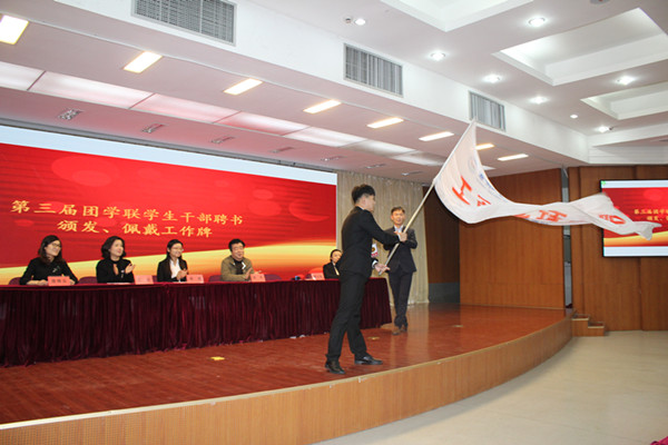 第三届社联主席、学生会副主席马铭阳代表学生干部带领全体参会学生宣誓。一句句发自肺腑的铿锵誓词表达着他们为学生服务的坚定信心。随后,第三届学生会主席邵晨旭郑重地从老师手里接过工商管理学院学生会会旗,并宣读了本年度学生会工作计划报告。之后,孔焱老师宣读了第三期学生骨干能力提升培训班培训计划,希望学生干部通过学习学生干部工作的定位和原则要求、学生干部应具备的素质与能力、办学生活动策划与开展,稿件撰写与宣传等内容,提升自身综合素质,增强团学队伍的凝聚力和战斗力,从而更好做好本职工作,服务学生。