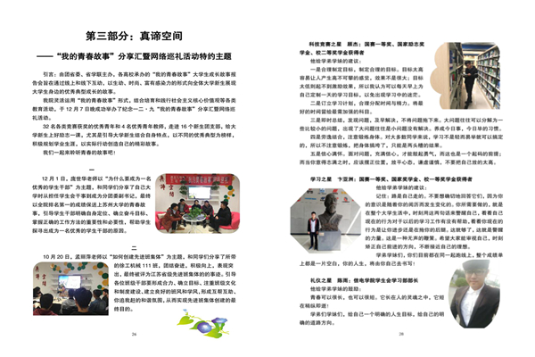 “学习身边榜样,汇聚前行力量”主题教育活动,特开设的栏目。以“我的青春故事”为主题,以线上直播与线下交流相结合的方法,收录了“辅导员讲自己的青春故事”和“身边榜样寄语学弟学妹”的内容,给650多名大学新生上好励志一课,尤其是引导大学新生结合自身特点,以不同的优秀典型为榜样,积极规划学业生涯,以实际行动创造自己的精彩故事。