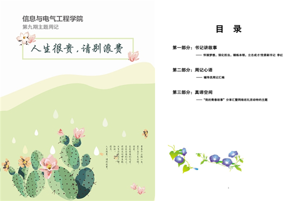 近日,信息与电气工程学院第九期主题周记《人生很贵,请别浪费》向学生发放。本期周记由“开卷语:书记讲故事”“周记心语——辅导员周记汇编”和“真谛空间——我的青春故事分享汇暨网络巡礼”等三个部分组成,寄语青年学生怀揣梦想,珍惜当下,常学身边榜样,积累前行力量。