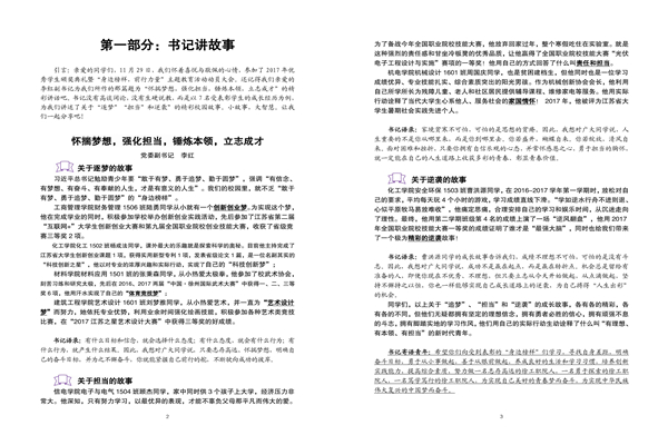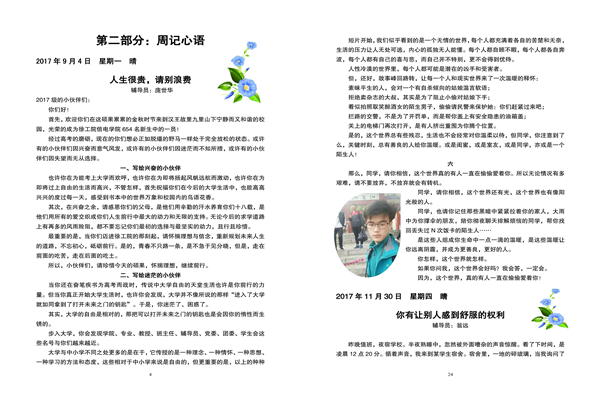 第二部分“周记心语”中,收录了2017年9月至11月辅导员周记,在这12篇周记中,既有发人深省的《人生很贵,请别浪费》和《电梯折射出的文明与礼仪》,又有温暖心灵的《同学,静下来,一切都会美好》和《这个世界,真的有人一直在偷偷爱着你》;既有答疑解惑的《同在屋檐下——宿舍人际关系处理的方法》和《做优秀学生干部请先正确回答这三个问题》,又有生涯规划的《大学,你规划好了吗?》和《大学,我来了》。同时,还结合学生学习《习近平的七年知青岁月》的热潮,收录了大连海事大学辅导员曲建武老师的《向习近平“七年知青生活”学习什么?》这篇精彩网文。每一篇都是辅导员送给学生的礼物,都是一周的心灵鸡汤,都是老师与学生沟通的桥梁。