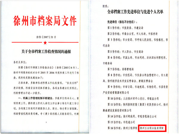 近日,徐州市档案局下发文件[徐档2017]31号,通报了徐州市2016、2017年档案工作检查情况。捕鱼达人破解版 综合档案室在第16协作组(院校组)中荣获先进集体称号,是全市院校组中两所获奖院校之一。