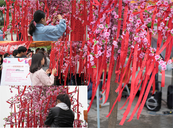 活动现场热烈而温暖,“一封家书寄乡思”传递着浓浓的亲情,承载着厚厚的温暖,一封封家书、一份份真情,将由大学生心理协会代为寄往最挂念的家人。“三行情书表爱意”活动中,学生们纷纷写下简短而精致的最美情书:“从爱你的青丝,一直等到,爱你花白的鬓角”;“我爱吃的,您都不爱吃,我竟信以为真”;“你常逗我是抽奖抽来的,如果真是如此,我才是最幸运的人儿”……“感恩树下送祝福”是大家最喜欢的活动之一,在场学生争先恐后的领取红丝带,一笔一划写下了最真诚的祝福和憧憬,并亲手系在感恩树上,挂满了红丝带的感恩树在细雨绵绵中显得格外耀眼。“明信片漂流传真情”活动吸引到众多学生驻足留言,“二十岁的我们已经长大,看到父母双鬓斑白,才恍然醒悟亲人已老,时光飞逝!如今只想伴您左右,说一句我爱您!”“感恩身边的每一个人,幸福才能常伴我们左右!”……明信片上没有华丽的辞藻,只有浓浓的感情和道不尽的爱意,真挚的情感跃然于卡片上,简单明了,细腻而美好。