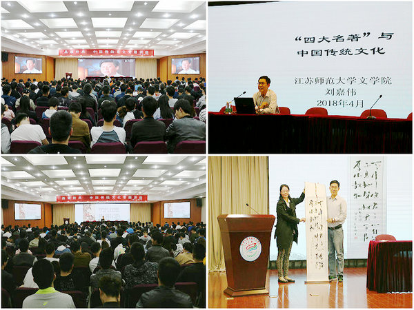 本次讲座特别邀请江苏师范大学的博士、教授、硕士生导师刘嘉伟教授主讲,刘教授为同学们带来传统文化与四大名著专题讲座。四大名著以历史的兴衰,社会的炎凉,事件的传奇,人物的悲欢等等故事或撼动人心、或悦人耳目、或破人愁闷。其所蕴含着的世道人生之理,更是给人以警醒和启迪。刘教授则从《三国演义》到《红楼梦》,对四大名著展开了充满激情和极富感染力的讲解,图文并茂地讲述了四大名著各自所蕴含的文化内涵;阐释了中国文化蕴藏的无限智慧与博大精深。讲座非常精彩,同学们听得也很专注,不时爆发出阵阵掌声。