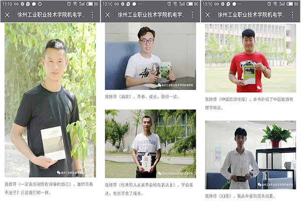 学院团总支号召同学们在校园里选择一处景色美好的地点,以自拍的形式与自己最喜欢的书籍合影,并附上心得体会,通过新媒体平台将它推荐给更多同学。同学们纷纷响应号召,积极晒出自己照片,秀出最青春的自己。
