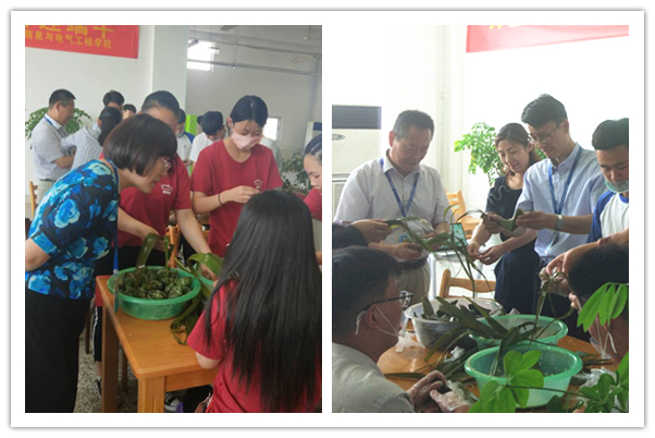 为深入挖掘中华优秀传统文化价值内涵,增强青年学生的文化自觉和文化自信,根据中共中央办公厅、国务院办公厅印发的《关于实施中华优秀传统文化传承发展工程的意见》精神,正值端午节到来之际,6月6日下午,信息与电气工程学院开展“我们的节日·端午”主题活动。信息与电气工程学院领导班子、全体辅导员、2017级班主任和近二百名学生参加了此次活动。他们一起在二食堂三楼包粽子、话习俗,共叙师生情。
