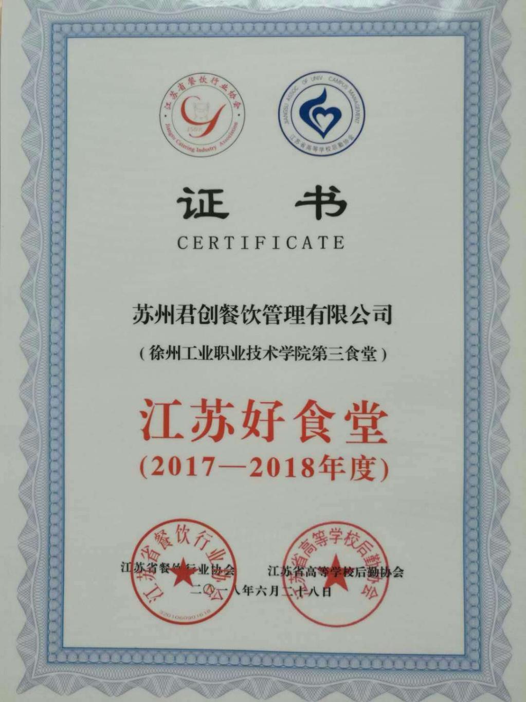 6月27日—28日,由江苏省餐饮行业协会和江苏省高等捕鱼达人破解版 后勤协会联合主办的2018江苏省团膳快餐发展大会在淮安召开,捕鱼达人破解版 学生第三食堂(苏州君创)在“2017-2018年度江苏好食堂”评选活动中喜获“江苏好食堂”荣誉称号。