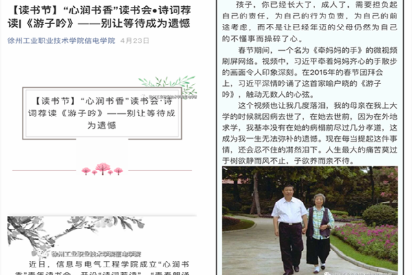 勤读书,培养良好阅读习惯。“21天读书签到”活动采取“线上+线下”的参与方式,同学们根据自己的需求选择书目阅读,每日阅读后将当天读后感发送至“徐工院团委”微信后台,作为当天读书的线上签到;同时,同学们通过线下撰写读书笔记的方式,参与到活动中来,将感想感悟汇聚在笔尖,并在阅读过程中进行分享。此外,机电工程学院团总支、材料工程学院团总支通过网站平台、微信群、班会课等形式,向同学们发起晨读倡议,并通过发放第二课堂成长积分等形式,吸引同学们走出宿舍,走向户外,在朝阳下朗读中华经典著作或英语美文等阅读材料,使学生收获晨读乐趣,为校园增添书香气息。