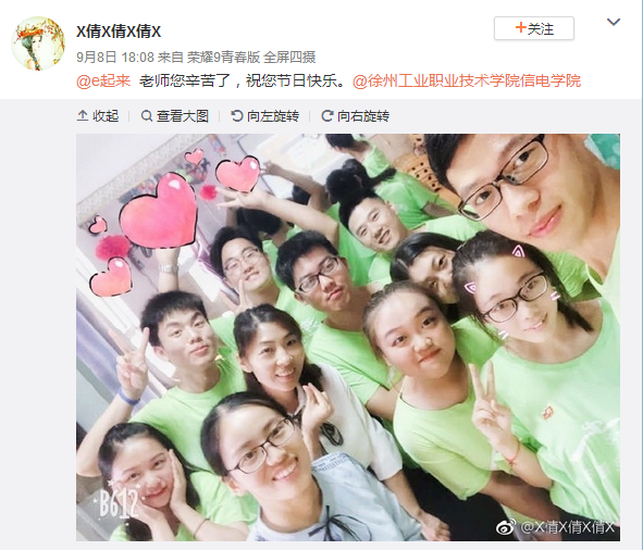 传统方式谢师恩。信电学院团总支、团学联在教师节前夕,带领全院同学通过赠贺卡、送祝福等传统的答谢方式向亲爱的恩师表达感激之情。同时,信电学院团总支的官方微博也被学生敬师、爱师的留言霸屏,一段段真挚的文字表达着学生对老师深深的祝福。