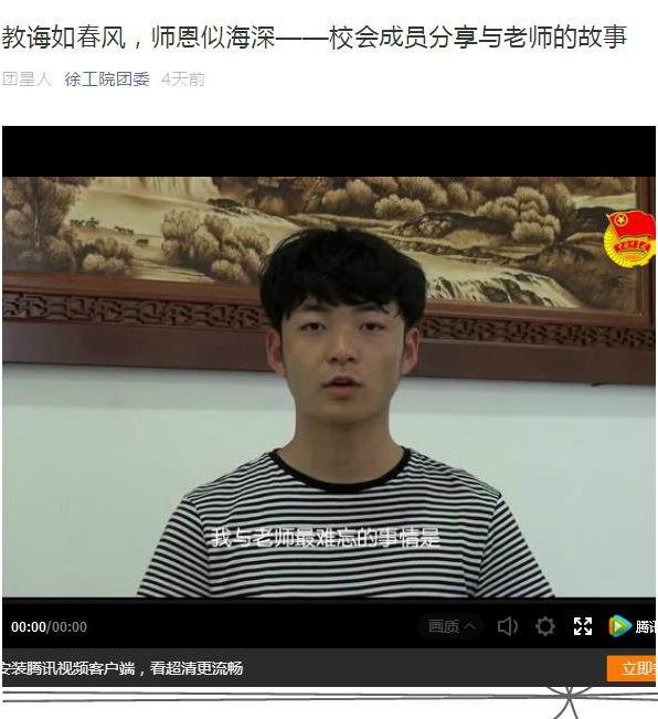 温馨视频谢师恩。校学生会、校社联学生干部在教师节前夕通过拍摄短视频的方式,对“老师给你留下的印象”、“你和老师之间发生过令你感动、难忘的事情”、“教师节马上到了,你想对老师说”三个主题进行了分享,视频发布在校团委官方微信公众号,大量的转发与传播,表达了徐工院学子对老师的感恩、感激之情。