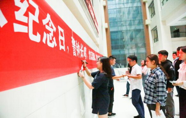 现场的同学们有序的站在条幅前签下自己的姓名,每一笔都在阐述着自己心中的激昂,每一位同学都铭记九·一八是中国人民心中永远不能忘却的一天,这一天的纪念不能成为一种形式,更应该是引起同学们铭记于心的历史!