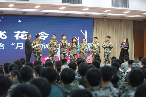 随后,精彩绝伦的“飞花令比拼”环节将整场晚会推向高潮。各连队代表踊跃上台,轮流讲出带“月”字诗词,从“人生代代无穷已,江月年年只相似”到“今人不见古时月,今月曾经照古人”,2018级萌新们将名篇佳句信手拈来,展现出深厚的诗词底蕴,大家你来我往,玩得不亦乐乎,激情洋溢的青春风采不时引起同学们的阵阵掌声。
