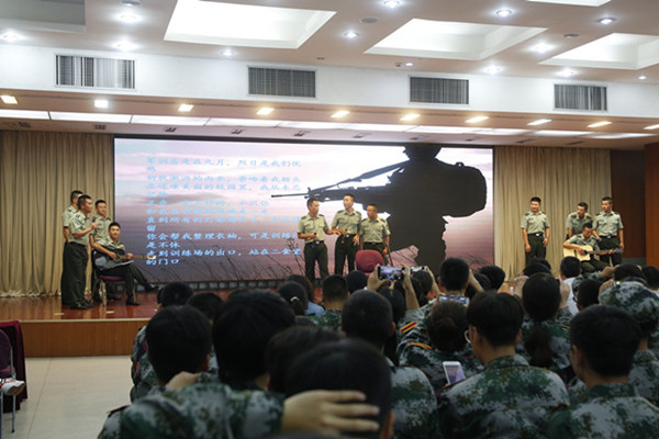 英姿飒爽的教官们也为大家带来了歌曲串烧,美妙的音乐旋律、教官们的深情演唱给同学们带来视听享受。同学们纷纷打开手机的手电筒挥舞着,合着音乐的节奏,一起唱响了军训版“成都”,将现场气氛推向了高潮。最后,全体辅导员老师给大家带来了诗朗诵《月之韵》,为中秋联欢晚会画上了圆满的句号。