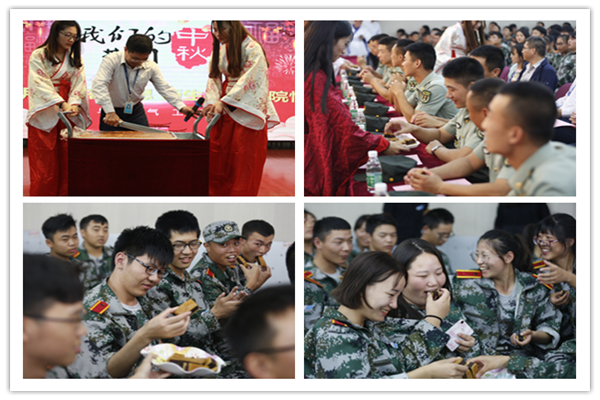 中秋月饼象征着团圆,寓意着圆满,晚会上身着汉服的“月亮使者”推出学院定制大月饼,丁振华书记为新生送上节日的祝福并亲自切开印有校徽的月饼,“月亮使者”将月饼分发给每位新生品尝。独家定制的“校徽大月饼”、体贴入微的一声问候,无不使远离家乡求学的学子感到家的温暖。