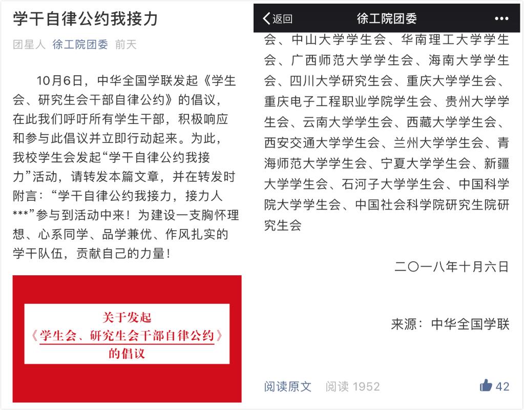 此次活动主要通过线上的方式进行,以团委微信公众号平台为主阵地,进行自律公约线上接力。 活动一经发起,校学生会、社团联合会、校级其他学生组织、各二级学院学生会、社团联合会及班长、团支书等学生干部纷纷积极响应,转发公约并附言署名,表明自己杜绝功利化、庸俗化、不忘初心恪守学干本分的觉悟与决心,响应热烈导致QQ空间一度呈现被“霸屏”的状态,微信该篇文章的阅读量在一天之内接近两千。