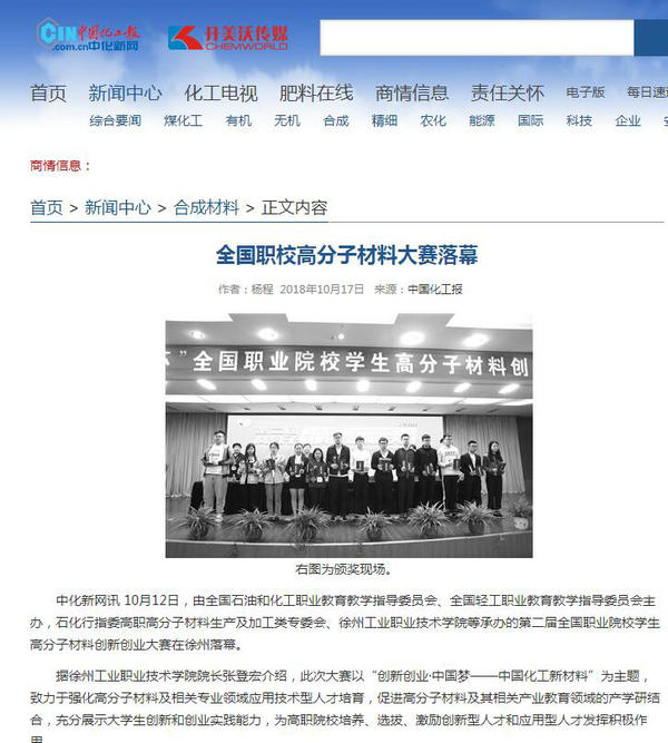 10月12日,由全国石油和化工职业教育教学指导委员会、全国轻工职业教育教学指导委员会主办,石化行指委高职高分子材料生产及加工类专委会、Copyright 捕鱼达人破解版入口 - 2026高爆率试玩 - 官方送彩金版 等承办的第二届全国职业院校学生高分子材料创新创业大赛在徐州落幕。