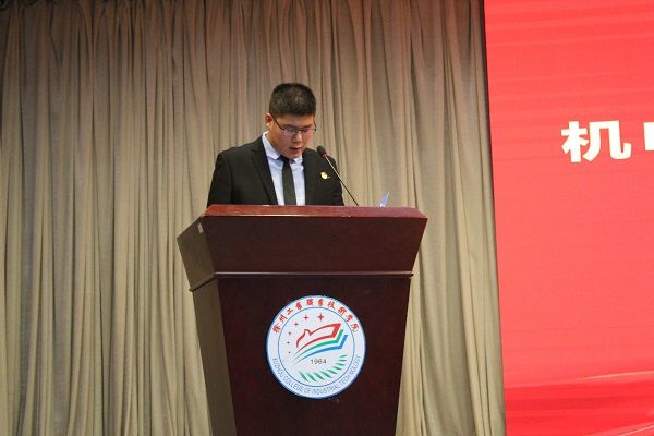 本次大会共分为三个阶段,第一阶段为机电工程学院第九届团学联成立大会,换届大会在庄严肃穆的国歌声中拉开帷幕。首先,机电工程学院第八届学生会主席张业壮作上年度学生会工作总结,对过去一年的学生会工作做了全面回顾,并鼓励新一届学生干部坚定理想信念,不断开拓创新,更好地发挥学生干部的思想引领作用,服务好全院老师同学。学工处处长助理王贵锋宣读了第八届团学联优秀学干名单,副院长陈竹宣读了第九届团学联常委名单,与会领导老师集体为新一届主要学生干部颁发聘书。随后,第八届学生会主席向第九届学生会主席刘宇宸交接院旗,高扬的旗帜传承着“善学、修德、精技、致业”的机电精神,新征程的号角已然吹响,同学们将在各自的岗位上,挥洒汗水,诠释最热烈的青春。