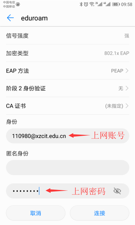 步骤二:链接eduroam,出现如下认证界面: