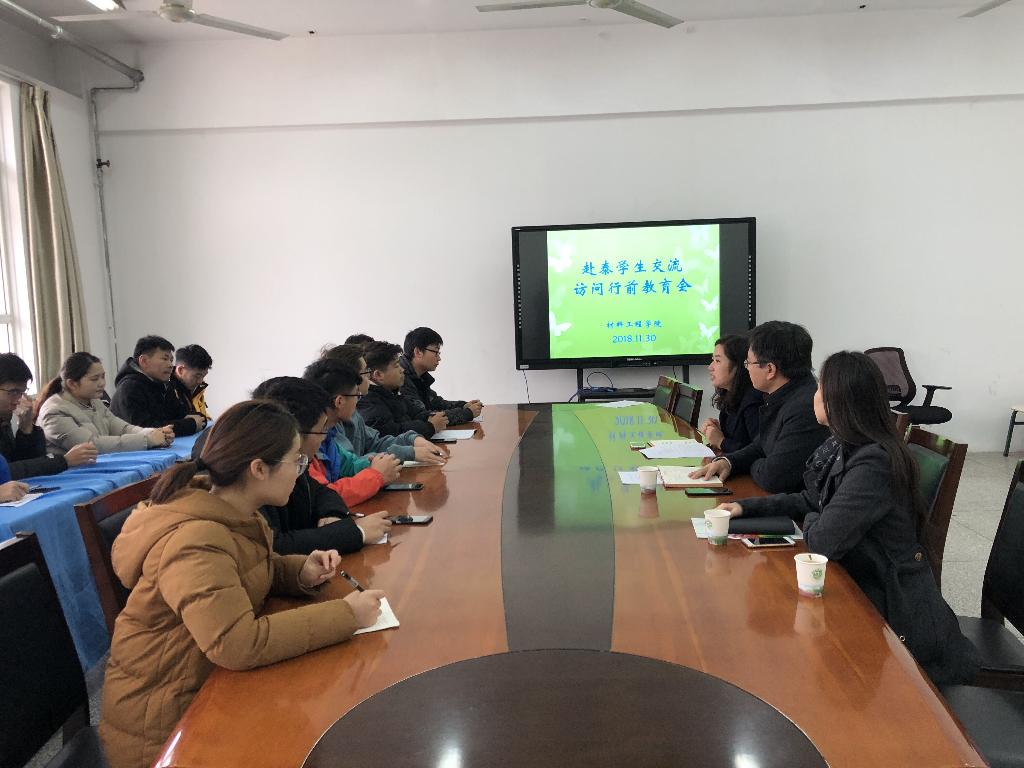 11月30日上午,在材料工程学院会议室召开了我院学生骨干赴泰国学习交流访问团组的行前教育会议。外事办主任王建华、材料工程学院副院长赵音以及即将赴泰国开展学习交流访问的所有团组人员参加会议。