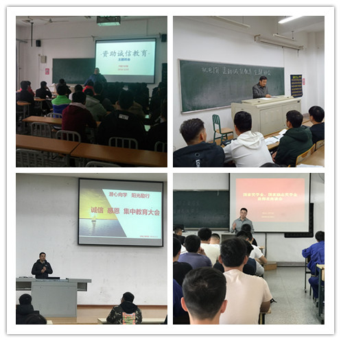 为了增强学生的诚信意识,弘扬励志精神,培育感恩美德,强化“资助育人”的实效,学院开展了“感恩、励志、诚信”系列教育。一是学院重视以思想引领培育学生自立自强精神,分别召开了国家励志奖学金学生、国家助学金获得者集中教育大会,会上,陈竹副院长希望同学们在国家资助政策的帮助下,满怀感激之情、感恩之心和社会责任感,用实际行动和优异成绩回报国家和社会的关爱。 二是通过开展“资助诚信教育”主题班会,让受资助学生了解诚信是做人之本,与我们的生活息息相关,并且倡导同学们从小事做起,履行诚信之约。