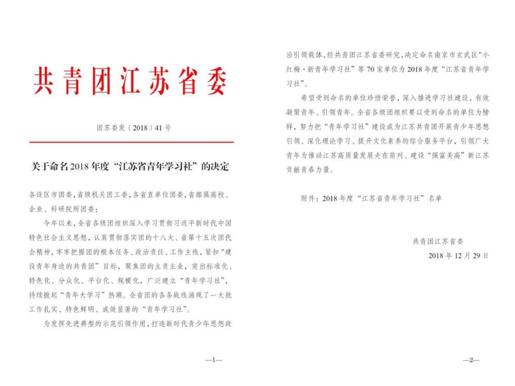 近日,共青团江苏省委下发《关于命名2018年度“江苏省青年学习社”的决定》,捕鱼达人破解版 “青年学习社”被命名为2018年度“江苏省青年学习社”(全省共20所高校,其中高职院校3所)。