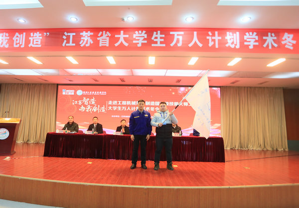 林书记为学员代表授旗,共同祝愿此次“江苏智造,由我创造——走进工程机械国家级技能大师工作室大学生万人计划学术冬令营“圆满成功。