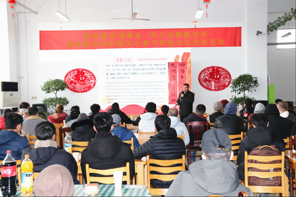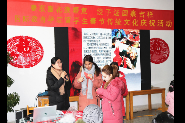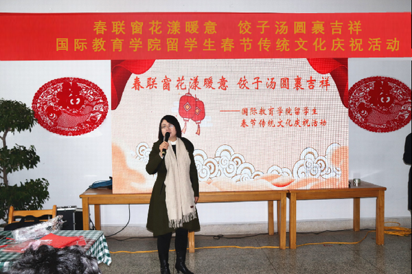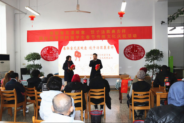 团圆的餐桌上摆放着“老八样”糕点水果,靓丽的屏幕上播放着春天到来的序曲。为进一步丰富留学生寒假生活,深入传播中华传统文化,2019年1月29日,国际教育学院举办了“春联窗花漾暖意饺子汤圆裹吉祥”留学生春节传统文化庆祝活动。国际教育学院院长王艳秋及全体管理人员出席了活动,活动由国际教育学院学院副院长张礼宁和苗坤老师主持。