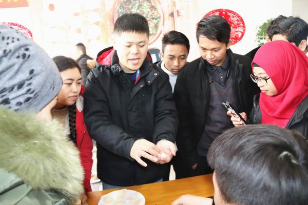 “清水飘芙蓉,元宝落玉盘”。主角饺子出场了。“拌馅”、“揉面”、“擀皮”,在孟醒老师指导下留学生忙的不亦乐乎。老师们纷纷走入人群手把手地教了起来,开始留学生还能“虚心学习”,不久就“技法纯熟、别出心裁”起来,各具民族特色的水饺纷纷出炉,中亚的“manta”、印尼的“siomay”,尼泊尔的“momo”,果真是“素衣台案前,巧手赛天工”。形态各异、别具特色的水饺裹满了留学生美好的祝愿和祈盼,更裹满了世界各民族间的深情厚谊。