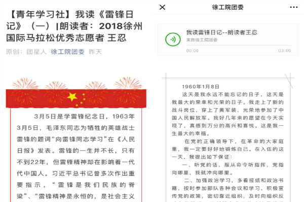 主题宣教,学习雷锋精神。校团委联动各二级学院团总支,以基层团支部为单位,召开“雷锋精神伴我成长”主题团课,讲解雷锋感人事迹,解读雷锋精神在新时代的内涵与意义,汲取榜样力量。此外,校团委以微信公众号平台为网络思想引领阵地,推出“我读雷锋日记”系列全媒体声音产品,动员在志愿服务活动中涌现出的先进个人重读雷锋日记并制作成音频素材在微信公众号平台进行展示,既使学生通过诵读进一步了解雷锋的生平事迹及精神内涵,又通过音频、图片、文字的立体展示树立学生身边的榜样,引导广大学生对标典型,学习先进。