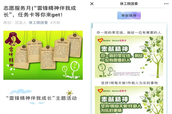成长任务,感受雷锋精神。校团委联动各二级学院团总支开展“雷锋精神•我的成长任务卡”活动,包括“存一周的零花钱,捐给一位有需要的人”、“坚持1-2周学会本专业就业岗位的职业礼仪”、“坚持一周每天1小时运动”、“坚持一周每天30分钟阅读计划”、“坚持一周每天关心国家大事”等三十余项任务,充分涵盖了乐于助人的奉献精神、刻苦钻研的钉子精神、艰苦奋斗的节约精神、认真勤奋的好学精神、默默无闻的螺丝钉精神等雷锋精神内涵,各项任务贴近学生生活且切实可行,同学们通过具体行动切实感受雷锋精神的深刻内涵,服务自身成长。