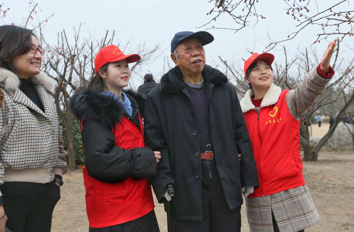 在探梅园里欣赏美景的游客中,有少许是老年人,他们行动不便,梅园里的梅花枝条高低错落,志愿者们搀扶老人上坡下坡、边走边聊,成为一道靓丽的风景线。
