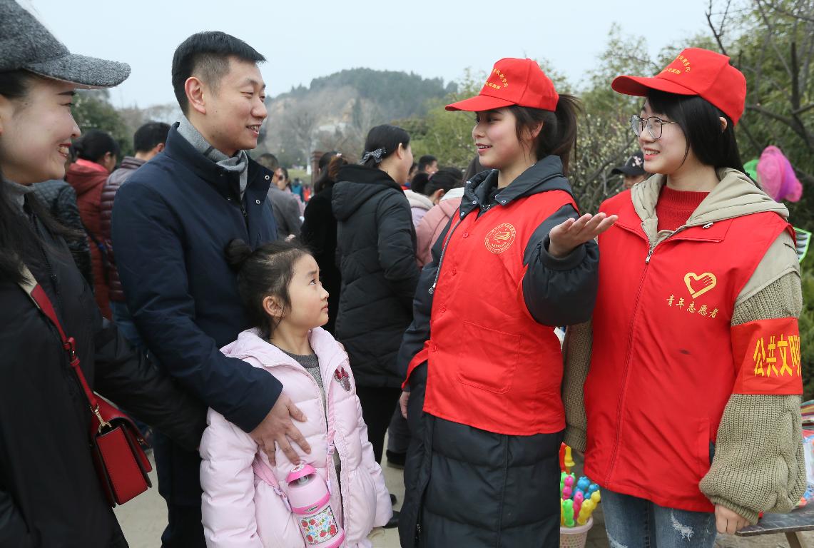 工商管理学院青春志愿服务队的许文欣等同学所学专业是旅游管理专业,该同学利用专业所长为游客答疑解惑,给游客指引游览路线,介绍龟山探梅园的发展史。