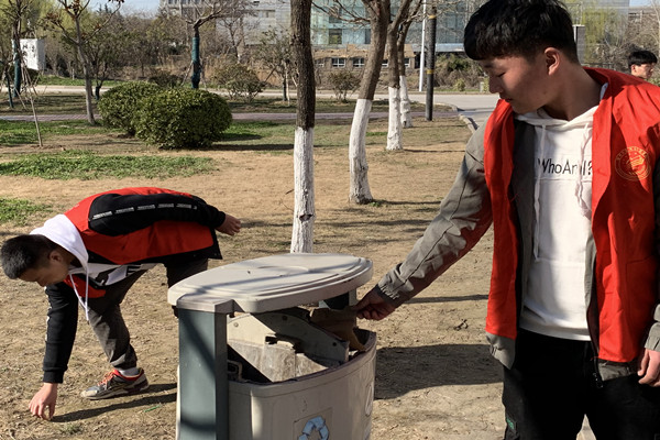 春意弥漫,学院绿化地中有一些垃圾,虽然工作辛苦,但也抵挡不住同学们积极地投身到劳动中去,大家纷纷手拎垃圾袋,捡拾草坪和道路上的纸巾,饮料瓶等各种垃圾,经过一段时间的辛勤劳作,大家看着整洁的校园,露出欣慰的笑容。