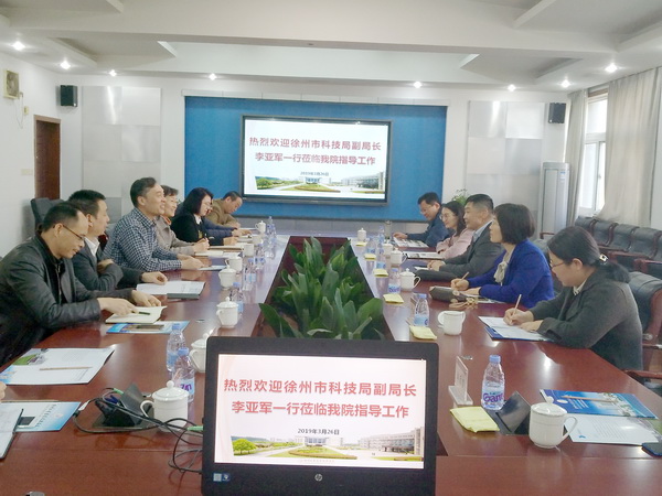 3月26日,徐州市科技局副局长李亚军等一行六人来捕鱼达人破解版 调研研发平台建设和科研开展情况,捕鱼达人破解版 党委书记祝木伟、副院长鲍桂楠、科技处相关人员以及科研骨干与李局长一行在行政楼三楼会议室进行座谈。