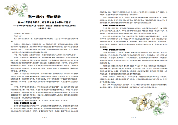 第一部分“书记寄语”中,收录了党委副书记李红老师在2018年优秀学生颁奖典礼上的讲话内容,李书记围绕习近平总书记在全国教育大会上的讲话,引导青年学生要敢于有梦、敢于追梦,鼓励青年学子用责任诠释梦想,用本领成就梦想,用奋斗点燃梦想,以饱满的精神状态和奋力前进的勇气,去书写属于自己的凌云壮志。