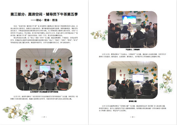 第三部分“辅导员下午茶”,以“初心·使命·担当”为主题,通过前期调研、个别谈话、分析总结等环节,团委副书记庞世华老师和四位辅导员老师分别从初心、使命、信仰、梦想等角度拟定交流主题和时间,引导学生志存高远,勤勉致知,并在实践中不断的提升和完善自我。