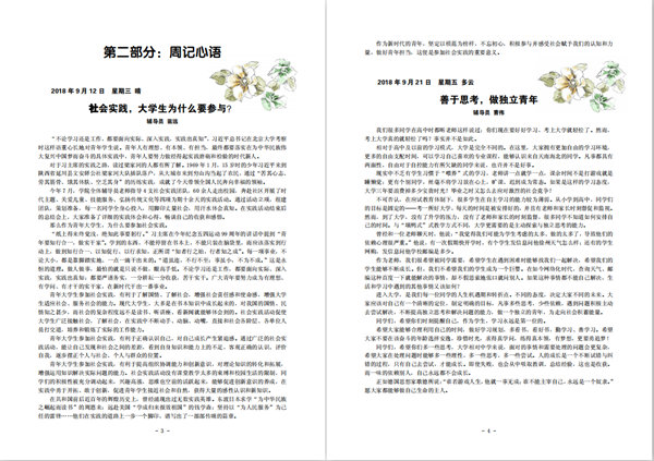第二部分“周记心语”中,收录了2018年9月至12月辅导员周记,在周记中,既有发人深省的《立足新时代,争做新青年》和《下得苦功夫,成就闪闪发光的自己》,又有答疑解惑的《社会实践,大学生为什么要参与?》和《老师,啥是共产主义信仰?》;既有指明方向的《同学,请放下手机》和《就业,你准备好了吗?》,又有心灵导航的《一道选择题,测测你的共情力》,周记的一笔一画无不渗透着辅导员对学生浓浓的爱,如春风化雨般滋养着他们不断成长。