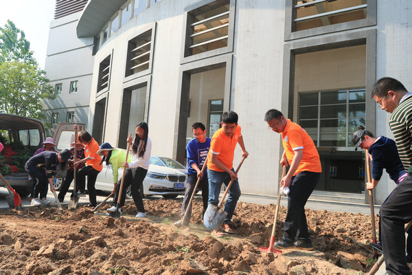 活动中,两个支部的党员同志热情高涨、干劲十足。在技术人员的指导下,全体党员以不言苦、不怕脏的精神,积极认真地挥锹松土、拉线挖坑、扶正花苗、培土浇水,大家通力合作、互相帮助、默契配合,共同栽种好每一棵花苗。经过两个小时的辛勤劳动,200棵芍药花扎根在校园花坛。