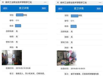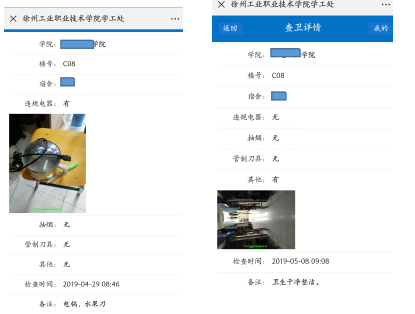 该功能主要用于发布宿舍检查反馈,宿管人员检查宿舍如发现卫生差、有违纪或者饮水机未关及时断电、门钥匙未拔等异常情况,通过拍照及文字描述方式上传系统,相应宿舍成员即可收到后台自动发送的站内提醒信息,辅导员登录账号后也可以实时查看管辖年级的宿舍违纪情况,这种方式使宿舍检查结果的通知途径更加快速便捷,同时也利于降低宿舍安全隐患的发生,同学们也表示这种方式既贴心又方便。