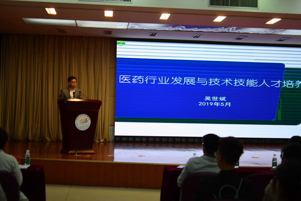 报告伊始,吴世斌总裁强调医药行业是一种特殊而神圣的行业,从事医药行业的人员要有强烈的责任感、使命感和敬业精神。随后他联系国内外实际情况,基于详实的材料,对医药行业的宏观环境、医药行业的市场及政策、医药行业的技术发展等作了深入讲解。针对技能型人才的培养,吴世斌总裁站在医药企业的角度,向与会的各位同学和老师讲述了毕业生的需求、行业发展的亟待需求、企业发展的人才需求、技能型人才的能力要求及技能型人才的培养方法,采用丰富的实例介绍了企业技能型人才的成就和未来发展路径,报告深入浅出、形象生动。