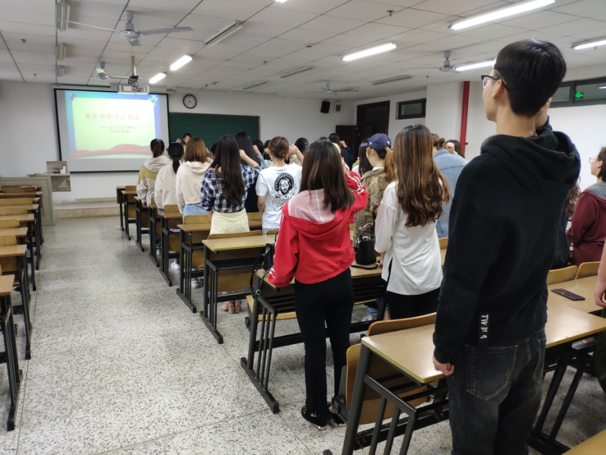 主题班会以深入学习宣传习近平新时代中国特色社会主义思想,宣传以宪法为核心的社会主义法律体系,宣传与高校相关的法律法规为主要内容。班主任通过文字、图片、事例、宣誓活动等进行了一次别开生面的法治教育主题班会。