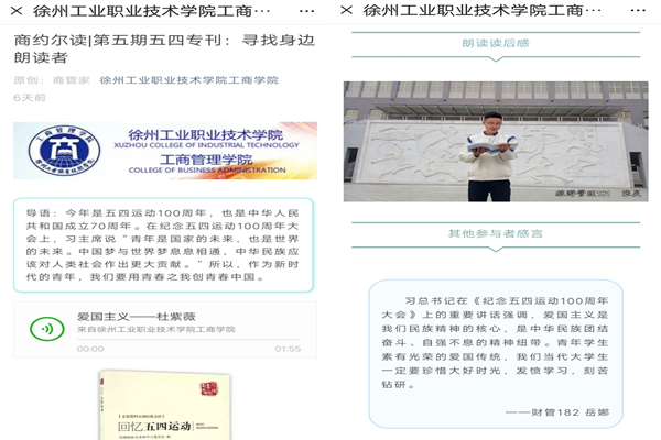 “百年五四”新媒体平台主题阅读活动——工商管理学院注重网络新媒体思政教育阵地建设,利用QQ群建立阅读兴趣组,同时在官方微信公众平台上,推出了“商约尔读”荐书系列和“寻找身边朗读者”校园诵读视频系列等阅读专栏。为纪念五四运动100周年,学院特以“百年五四”为主题,在专栏中开展了主题荐书和校园经典诵读活动。活动通过推荐经典书目如《北大在1919——九零后的崛起》,引导同学们深入学习五四先驱们的爱国主义精神;通过在校园美景中朗读《共鉴五四》、《回忆五四运动》等红色经典书籍,使同学们深切感受到现在优越的学习环境来之不易,理应以革命先辈为榜样,好好珍惜学习机会,勇于承担历史使命,为实现中华民族的伟大复兴而努力奋斗。