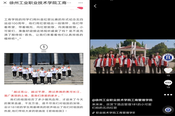 “经典与青春同行”抖音红歌比赛——为生动的展现我院学生的爱国热情,学院特举行“经典与青春同行”抖音红歌比赛。此次活动,采取了短视频拍摄的流行元素,均由同学们自己组织、设计和录制,学院经过对16个报名作品的仔细评选,共选出8个班级的作品在工商管理学院官方微信公众平台上进行展示和比拼。视频中,同学们整齐着装排练、巧妙设计场景、精心选取校园美景,深情唱出《歌唱祖国》、《我的祖国》、《红旗飘飘》、《我的中国心》等耳熟能详的红色歌曲,既表达了同学们的爱国之情,也培养了团结精神。