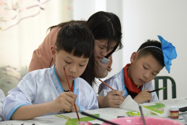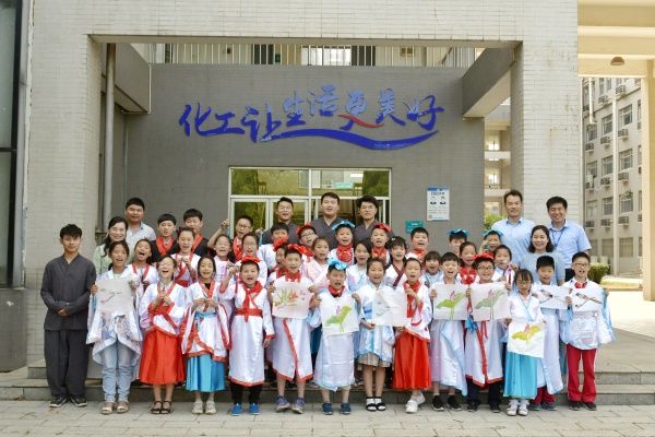 的学生代表在美育传播志愿者的带领下来到美育工作室,孩子们换上传统汉服,与大哥哥大姐姐们同绘画,共品茶,一起背诵诗词,学习体验中华传统文化。随后,孩子们来到实验室参与实验,感受“化工让生活更美好”,在孩子们心里播撒下了科学的种子。
