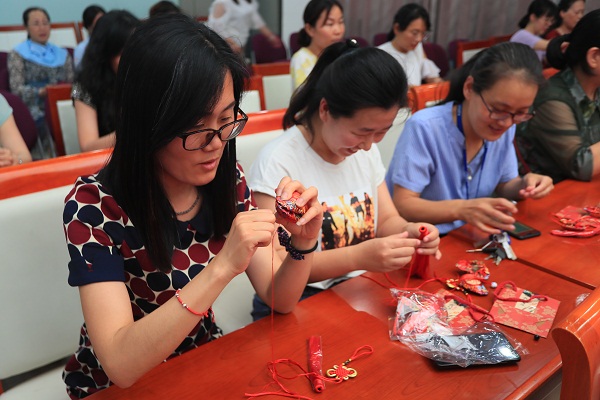 本次活动由校妇委会特邀马庄香包文化工作室技术指导老师夏老师和常老师来现场进行香包文化与香包制作方法讲授,来自全校各单位、部门的100余名女教职工参与现场制作活动。