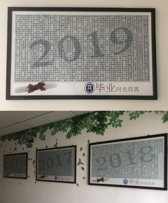 在B18楼11层工商管理学院老师办公区域的一面墙上,有一幅精美的喷绘画,这幅画是由821名工商管理学院2019届毕业生的名字组成的,旁边是2016届、2017届、2018届全体毕业生名字组成的纪念画....这是工商学院对每一届毕业生表示出的尊重和关怀。