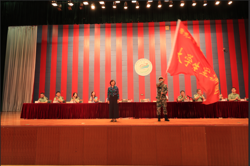 李红副书记向军训团团长吴晓彬同志授予军训团团旗,并作了以“向军人看齐,与榜样对标,争当军训标兵”为题的军训动员讲话。