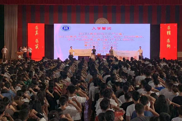 体育馆隆重举行。院长张恒中,党总支书记罗军,副院长王志峰、秦黎明,党总支委员刘勇、团总支书记曹远森及我院全体辅导员老师、2019级班主任出席入学仪式。我院2019级849名全体新生参加了入学仪式。典礼由秦黎明副院长主持。